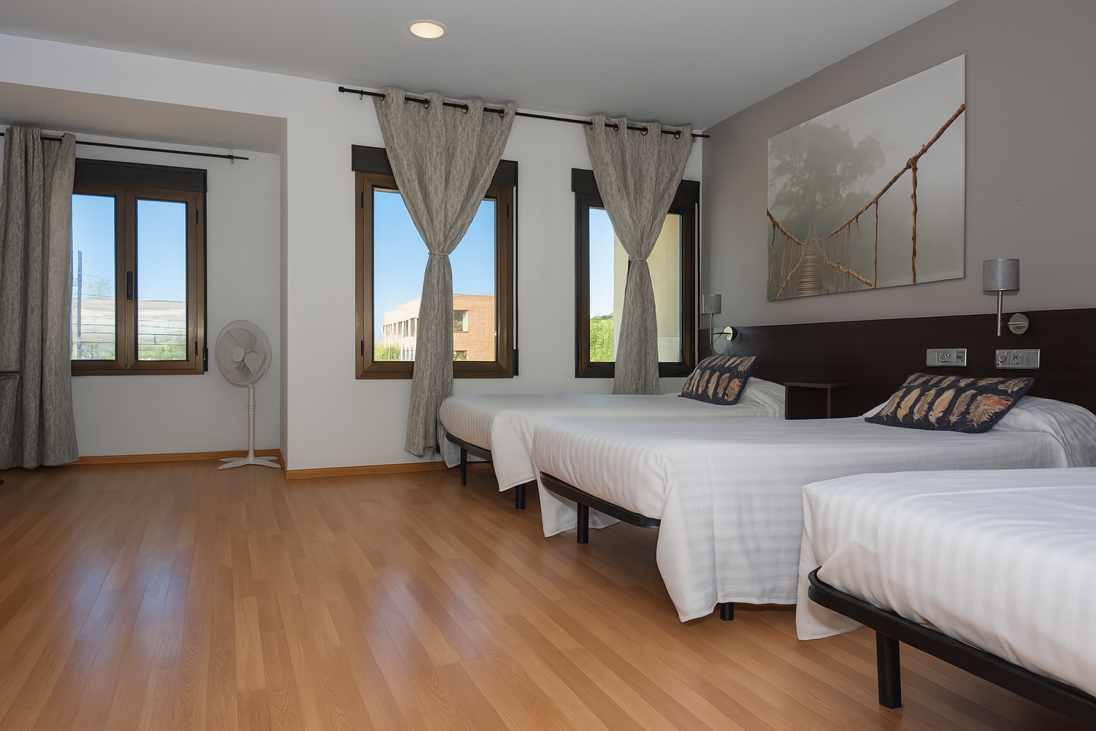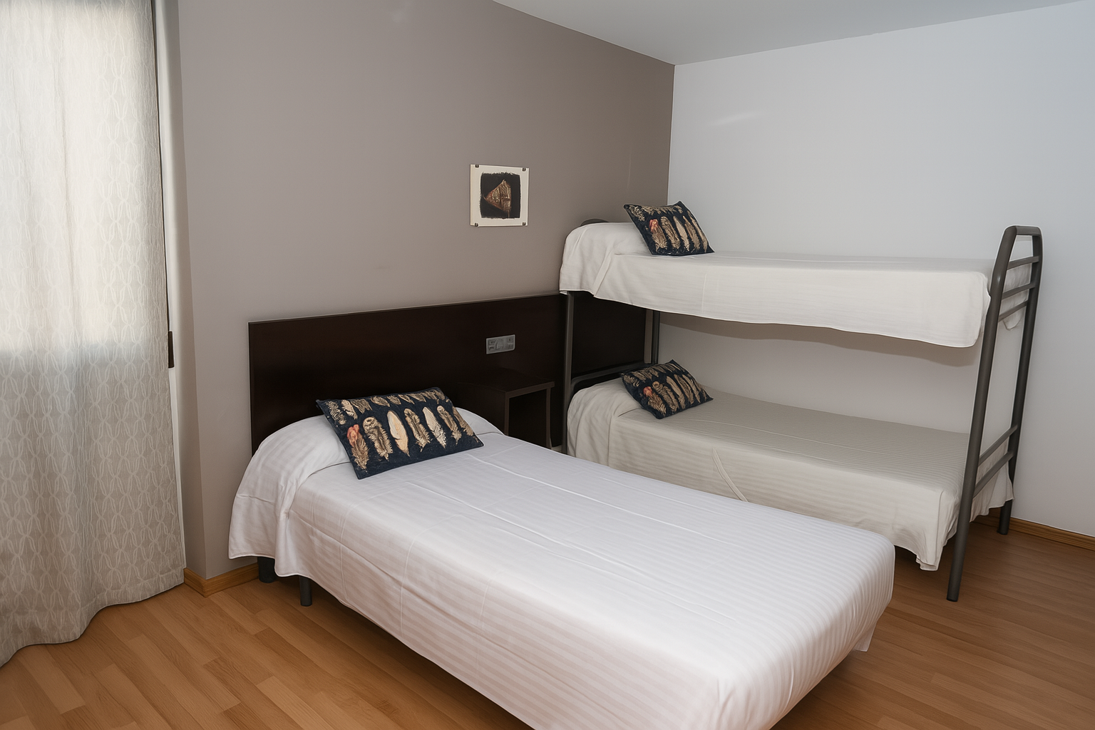 Esta habitación está diseñada para quienes viajan en grupo y valoran tanto la comodidad como la funcionalidad. Con tres camas individuales o una cama doble combinada con una litera, se adapta a diferentes necesidades . La amplitud del espacio permite moverse con libertad, mientras que los detalles decorativos aportan calidez y personalidad. Ideal para familias, compañeros de trabajo o amigos que buscan una estancia práctica y agradable.